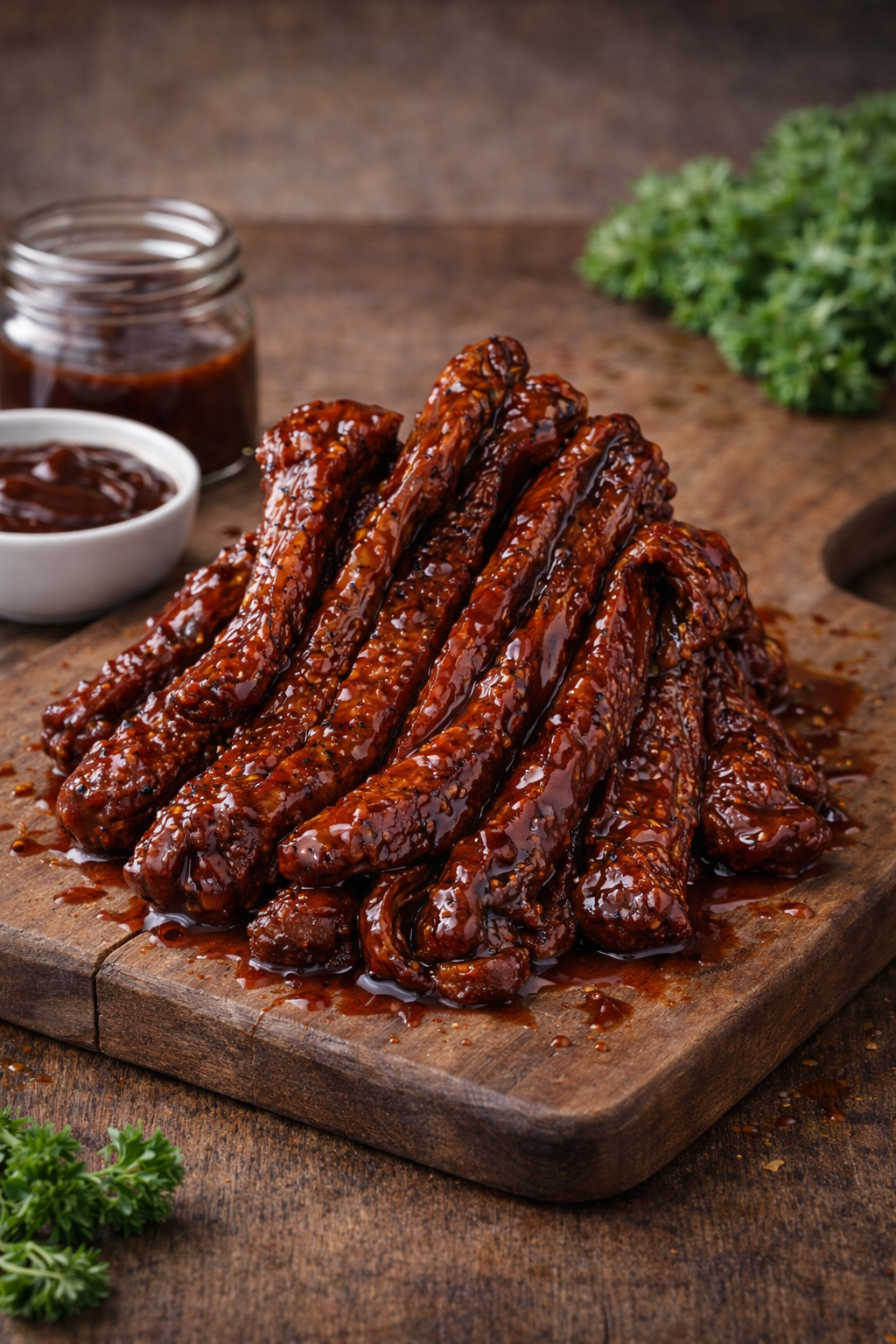 Our homemade Turkey Jerky, marinated in zesty BBQ sauce. Delish!