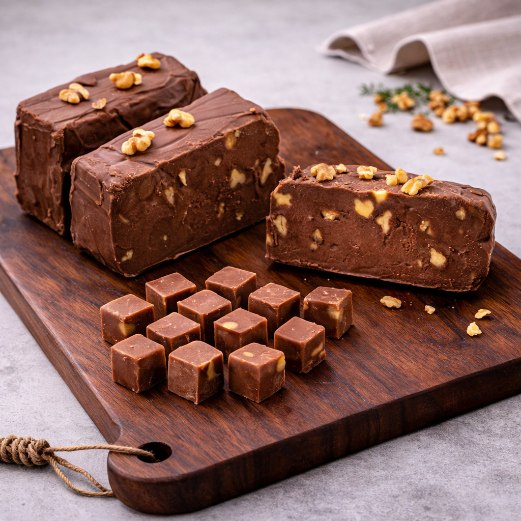 Ingredients: processed cheddar cheese, chocolate, powdered sugar, butter and walnuts.