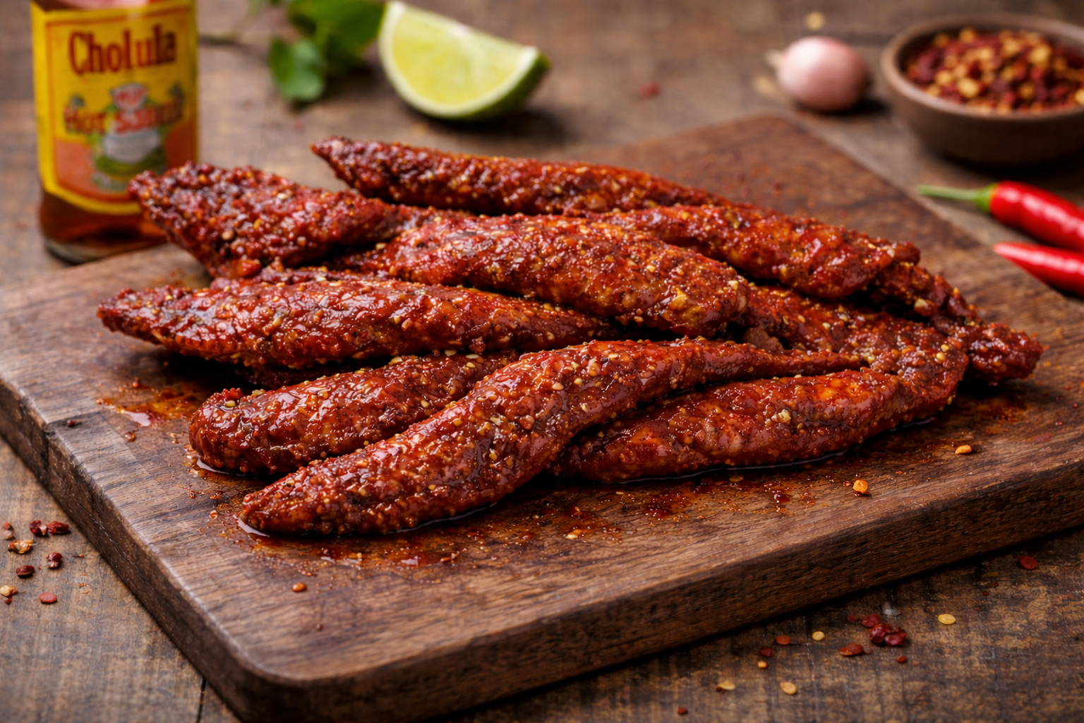 Homemade beef jerky with spicy hot cayenne pepper spice and sauce.