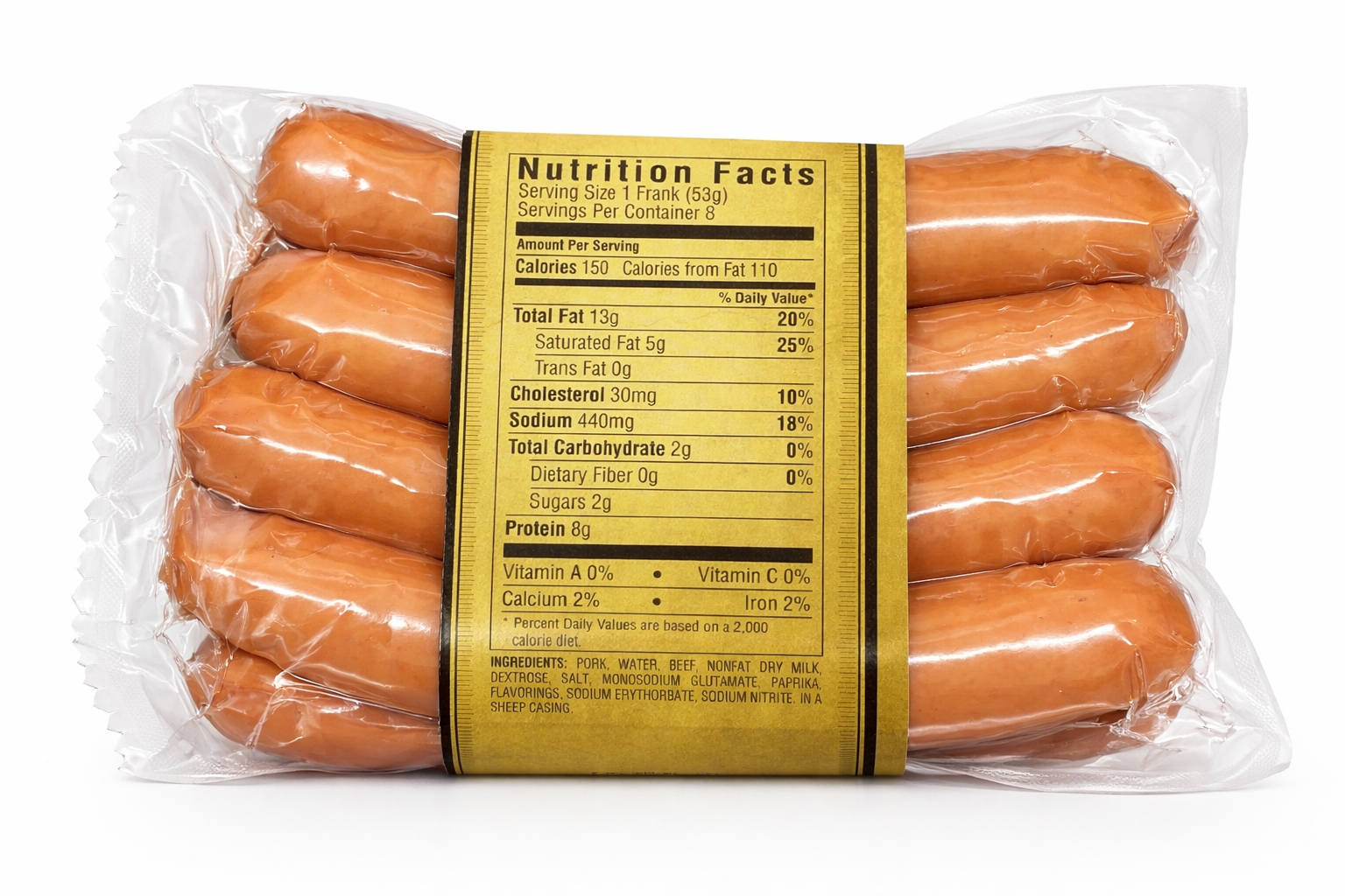 Ingredients: Pork, Water, Beef, Nonfat Dry Milk, Dextrose, Salt, Monosodium Glutamate, Paprika, Flavorings, Sodium Erythorbate, Sodium Nitrite. Packed into a Sheep Casing.