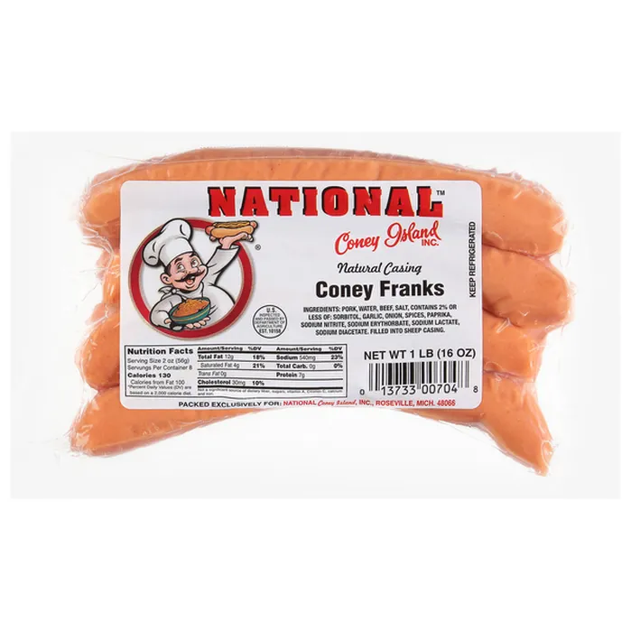 From Detroit, MI area’s own National Coney Island, Inc. These natural casing franks are a bun full – great for cookouts! Be sure to add the National Coney Island Coney Sauce as well for an authentic Detroit style coney dog! Delicious!